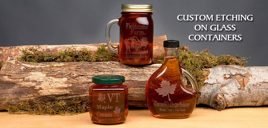 New England Container Company offers custom etching on glass maple containers for your sugar business. Customers can either purchase glass containers from New England Container Company or use their own glass containers for custom etching.
